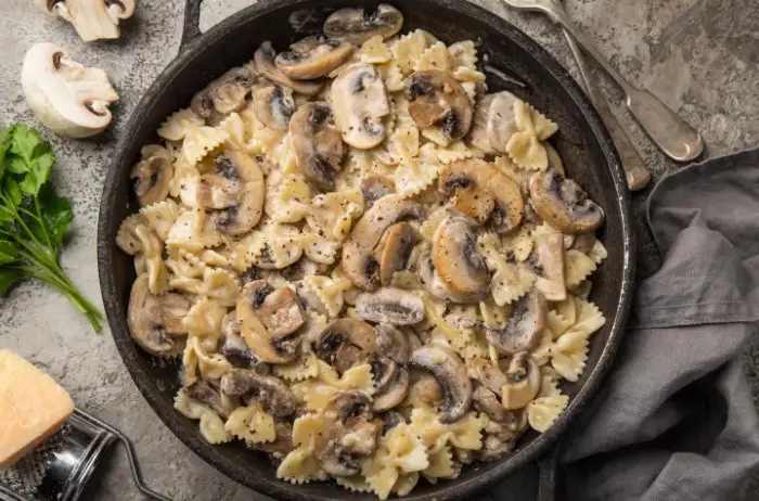 - Add the drained farfalle rigate to the skillet, tossing to coat the pasta evenly with the creamy mushroom sauce. If the sauce is too thick, add a bit of reserved pasta water to reach your desired consistency.